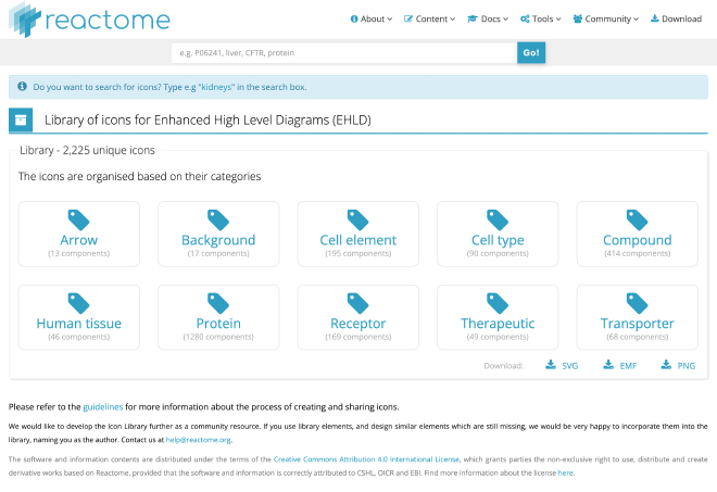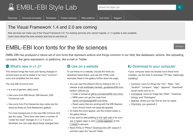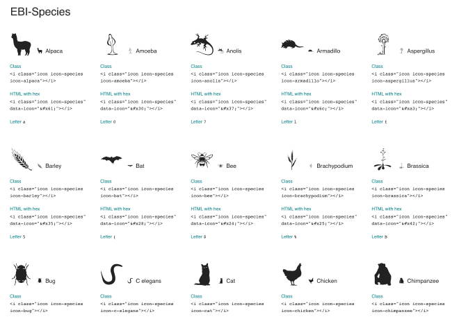 EMBL-EBI has produced a robust set of icon fonts that represent actions and things common in our field, like databases; actions, like uploading; concepts, like gene expression; or platforms, like e-mail or Twitter.