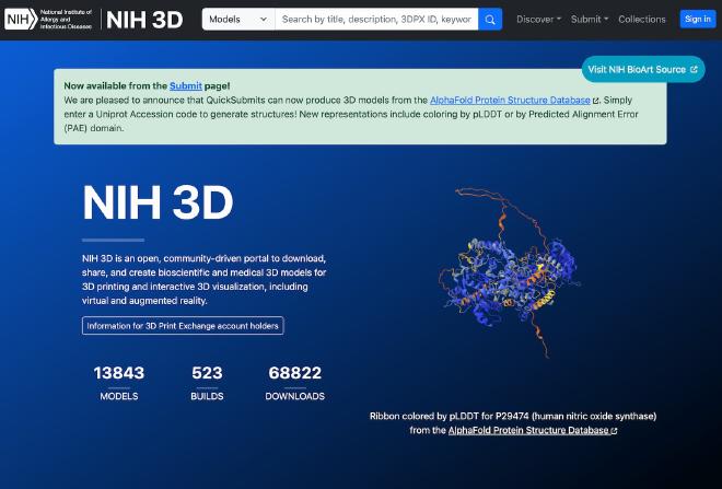 NIH 3D is an open, community-driven portal to download, share, and create bioscientific and medical 3D models for 3D printing and interactive 3D visualization, including virtual and augmented reality.