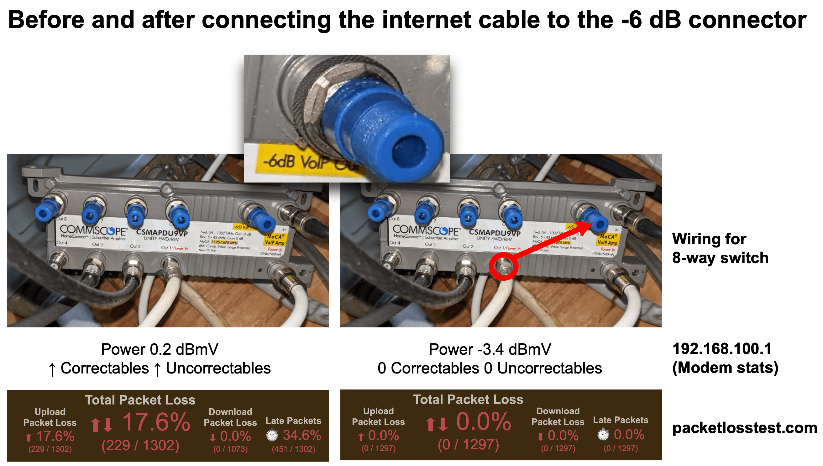 An internet connection with high packet loss is frustating to use. When packets of data are lost, phone calls over wifi can be randomly punctuated with silence. Zoom meetings might get frozen and unfrozen at unpredictable times. Using the internet is unpleasant when the connection is unstable. Here, I will show that one reason for high packet loss can be low power in the coaxial cable that connects to the modem.