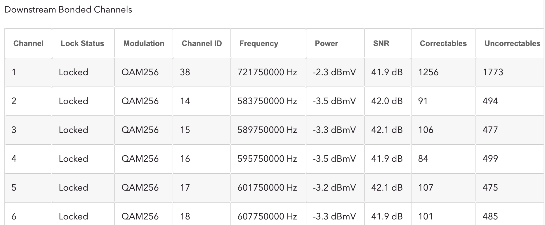 SammyFL shared a lot of modem statistics about Downstream Bonded Channels. The posts helped me to infer that Correctables and Uncorrectables are counting the number of errors, so both values should be 0 in an ideal world.
