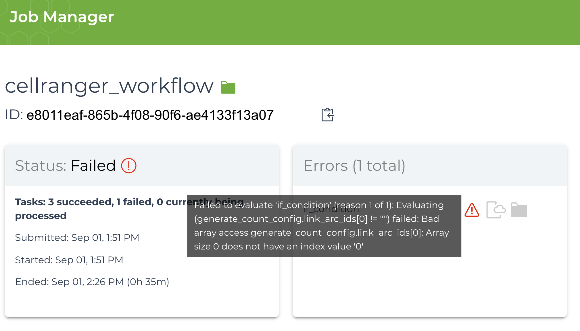 Error messages from downstream software executed by the workflow (e.g. Cell Ranger) appear in the document-with-a-cloud log file