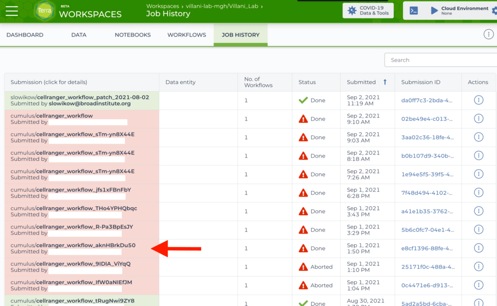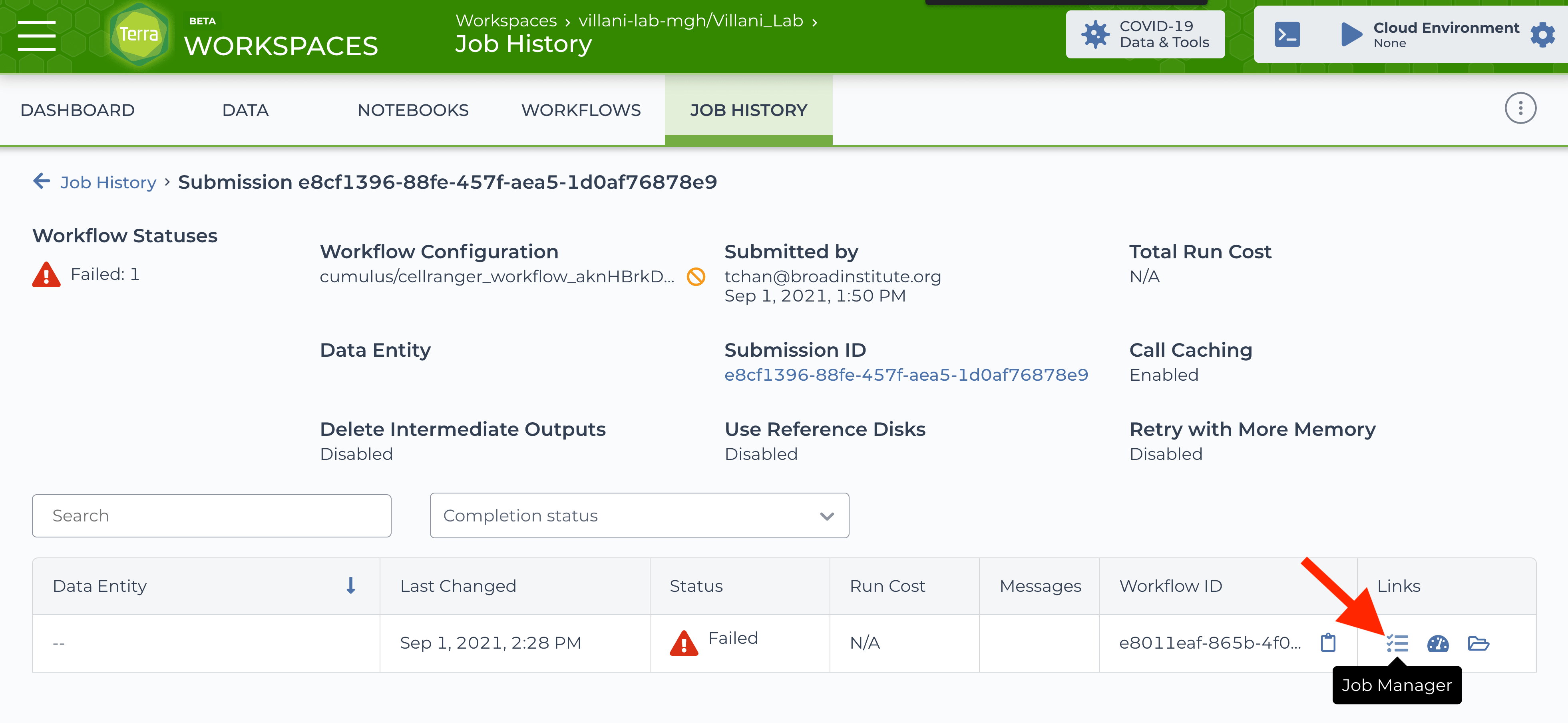 Error messages from the workflow code appear only on the Terra user interface next to the red icon