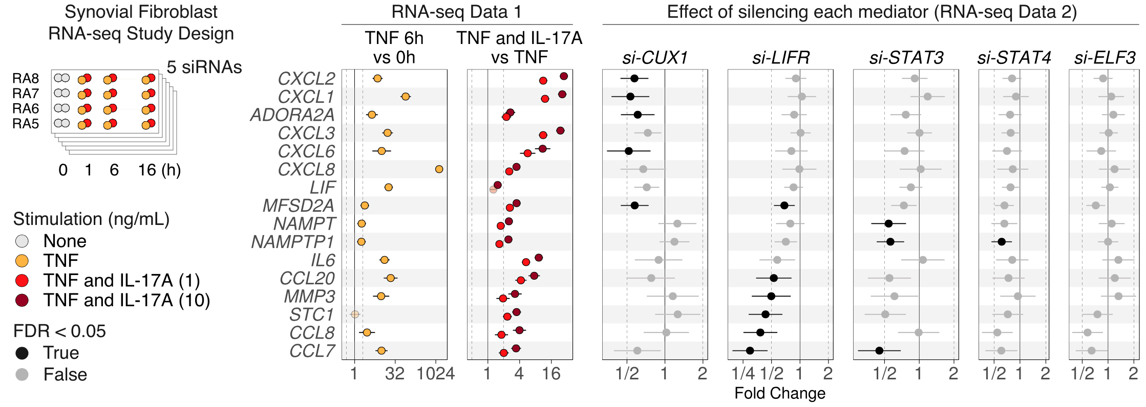 The role of stromal fibroblasts in chronic inflammation is unfolding. In rheumatoid arthritis, leukocyte-derived cytokines TNF and IL-17A work together, activating fibroblasts to become a dominant source of the hallmark cytokine IL-6. However, IL-17A alone has minimal effect on fibroblasts. To identify key mediators of the synergistic response to TNF and IL-17A in human synovial fibroblasts, we performed time series, dose–response, and gene-silencing transcriptomics experiments. Here we show that in combination with TNF, IL-17A selectively induces a specific set of genes mediated by factors including cut-like homeobox 1 (CUX1) and IκBζ (NFKBIZ). In the promoters of CXCL1 , CXCL2 , and CXCL3 , we found a putative CUX1–NF-κB binding motif not found elsewhere in the genome. CUX1 and NF-κB p65 mediate transcription of these genes independent of LIFR, STAT3, STAT4, and ELF3. Transcription of NFKBIZ , encoding the atypical IκB factor IκBζ, is IL-17A dose-dependent, and IκBζ only mediates the transcriptional response to TNF and IL-17A, but not to TNF alone. In fibroblasts, IL-17A response depends on CUX1 and IκBζ to engage the NF-κB complex to produce chemoattractants for neutrophil and monocyte recruitment.